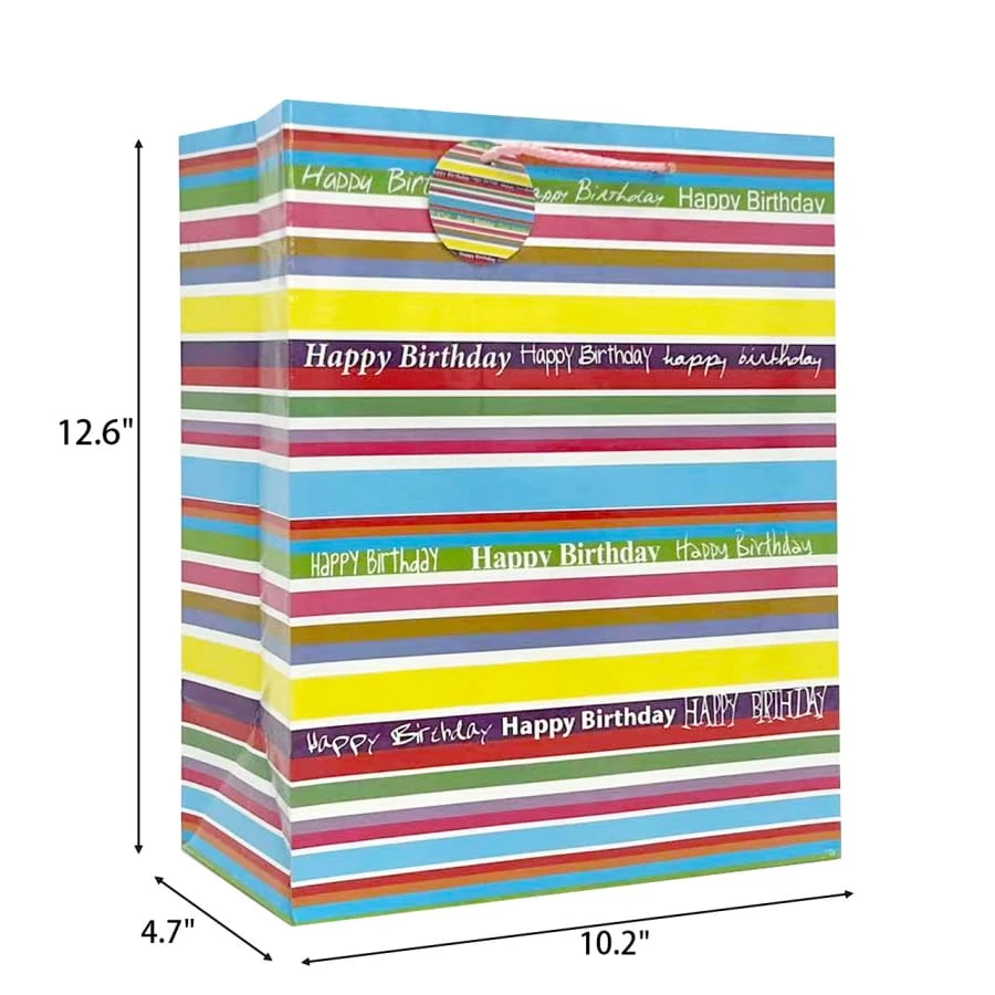 Это подарочный пакет на день рождения изготовлен из мелованной бумаги и украшен изысканным разноцветным полосатым рисунком, что делает его подходящим для празднования дня рождения. Пакет оснащен ручкой, что делает его удобным для переноски подарков. Яркие цвета и надпись "С днем рождения" придают ему праздничную атмосферу, что делает его идеальным выбором для упаковки подарков.